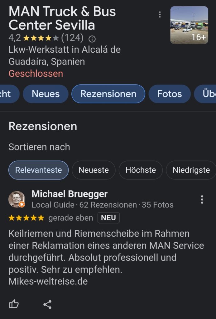 Ich bin seit heute Vormittag hier, in Sevilla bei MAN um die weitere Reklamation zum Thema Keilriemen…