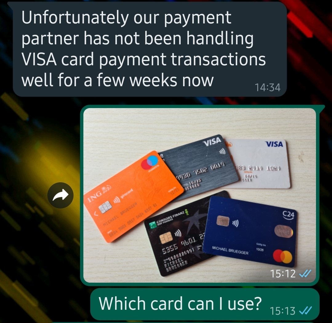 Nach langem hin und her hat mir der „Support“ mitgeteilt das ich halt eine andere Kreditkarte von Master Card komplett neu konfigurieren soll, weil sie bereits seit Wochen wissen, daß es mit VISA Probleme gibt.