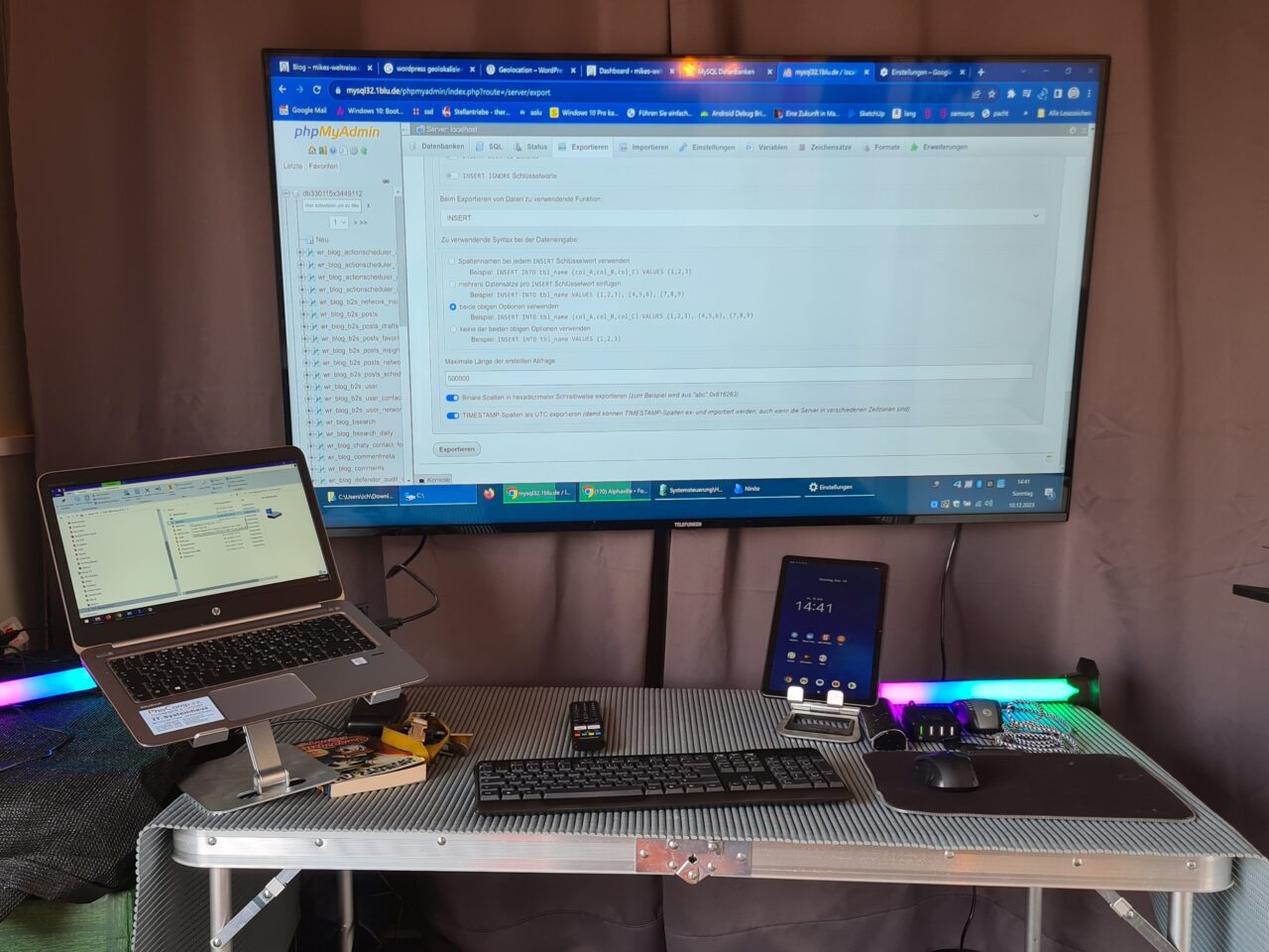 Man beachte am Notebook die eingestellte „große“ Schrift gegenüber dem 58″ 4K Fernseher mit riesiger Schrift.