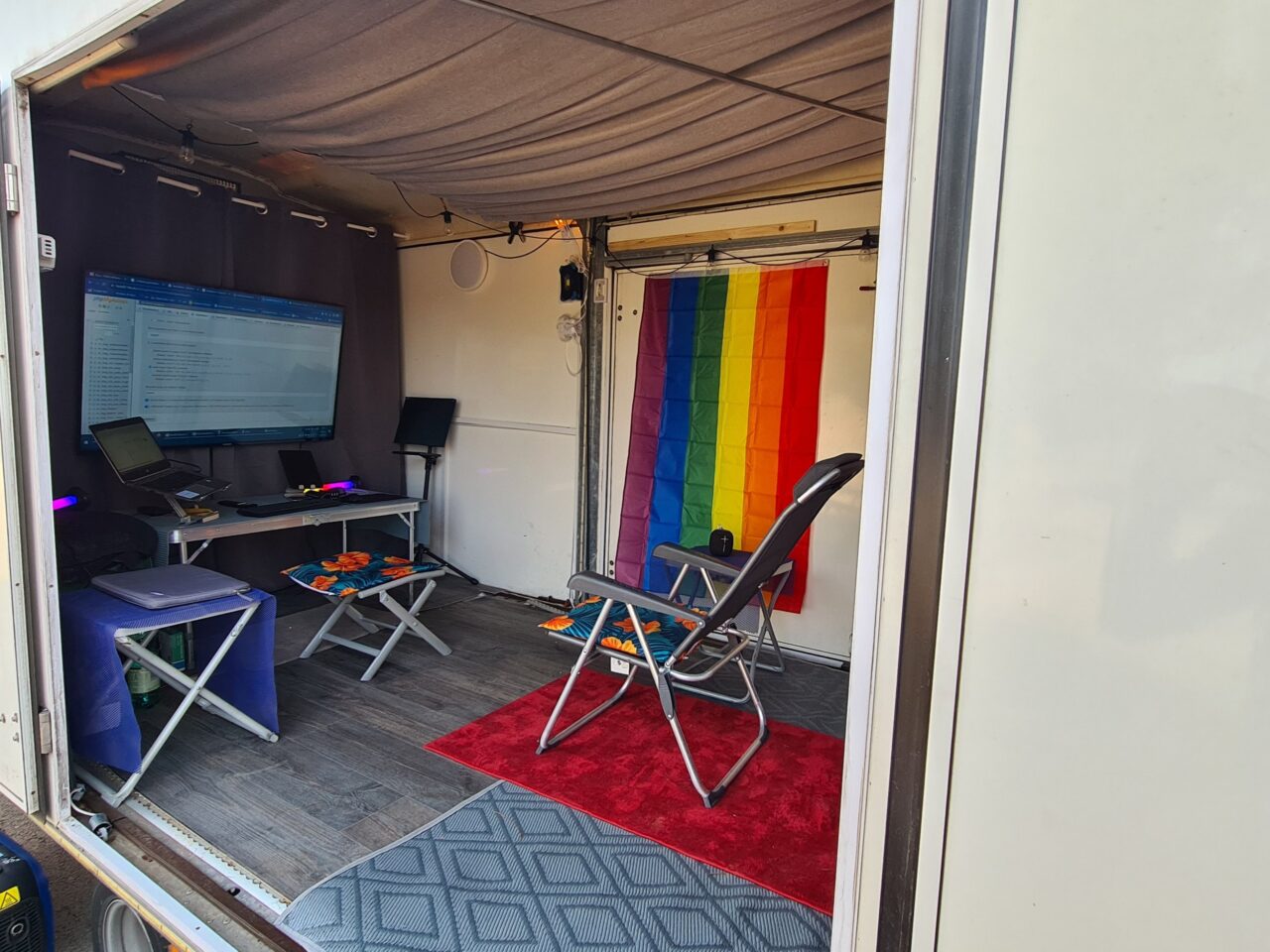 Im Anhänger ist jetzt endlich neben dem 3D Drucker, dem LaserCutter auch der Kompuda Arbeitsplatz mit angenehmen Bildschirmen eingerichtet.