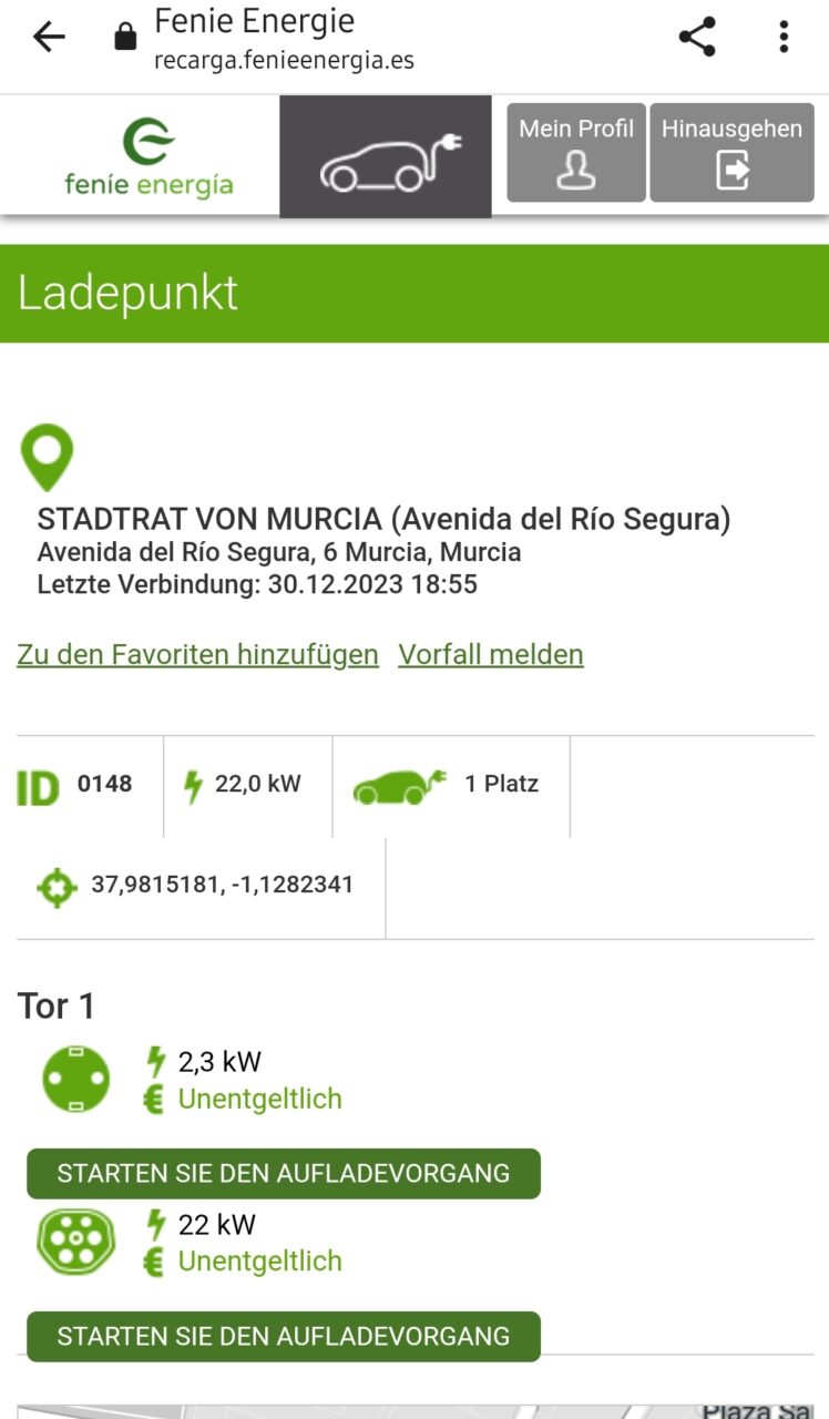(Murcia, Andalusien) Endlich eine Ladestation, die auch existiert. War bereits im Vorfeld zweimal in der City gescheitert.