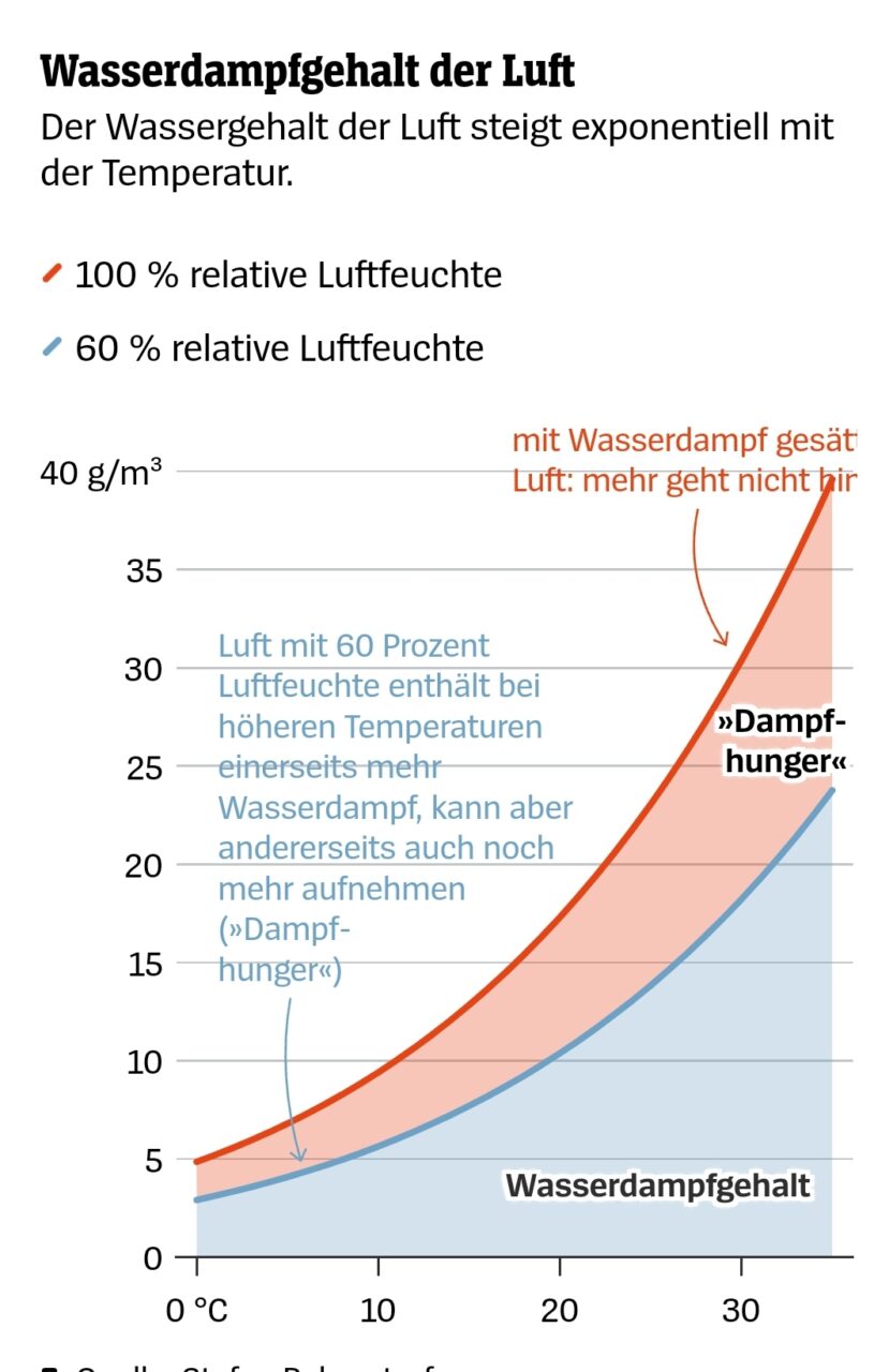 Diesen Sommer konnte man in den sozialen Medien wieder die »Klimaskeptiker« lamentieren sehen: »Eben noch sollte der Klimawandel an der Dürre schuld sein, und jetzt auf einmal am starken Regen?!« Zugegeben, das klingt erst mal widersprüchlich. Trotzdem ist beides wahr: Es sind zwei Seiten einer Medaille, genauer des CC-Gesetzes. Denn weil warme Luft mehr Wasserdampf aufnehmen kann, nimmt auch der sogenannte Dampfhunger der Atmosphäre exponentiell zu, wie die Grafik zeigt. Wasser verdunstet schneller, wenn die Luft den Wasserdampf begierig aufnimmt und abtransportiert. Die wärmere Luft saugt geradezu das Wasser aus Böden und Vegetation.