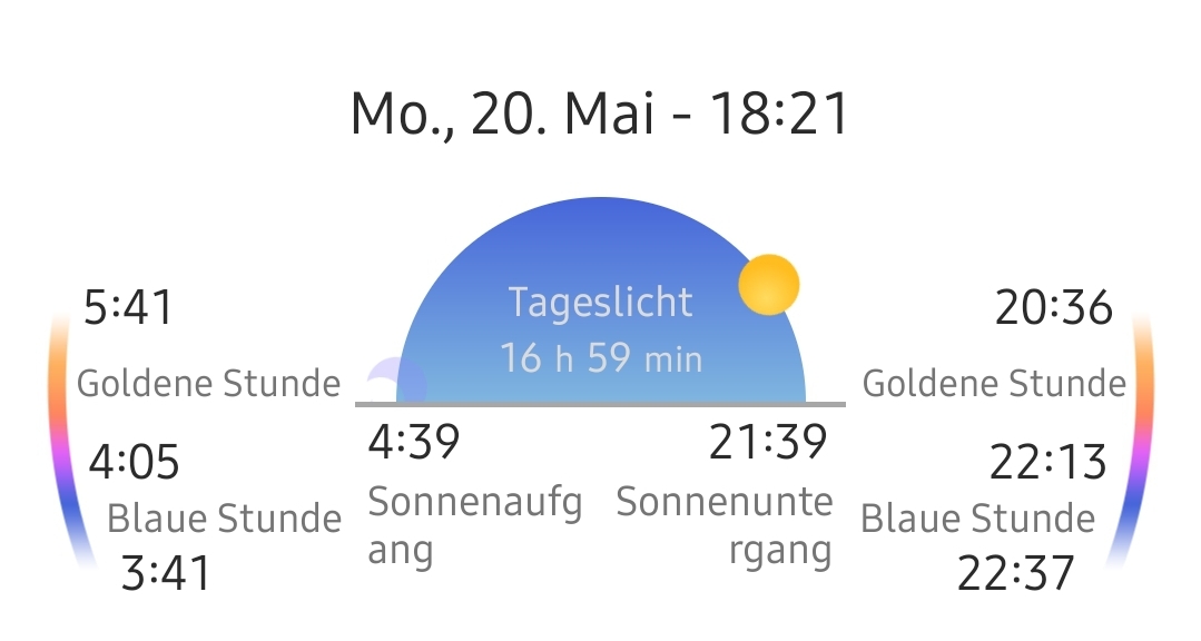 Fast 17 Stunden Licht, siehe unten, dazu abends ab etwa 20:00 bis 22:30 angenehmes diffuses Licht.