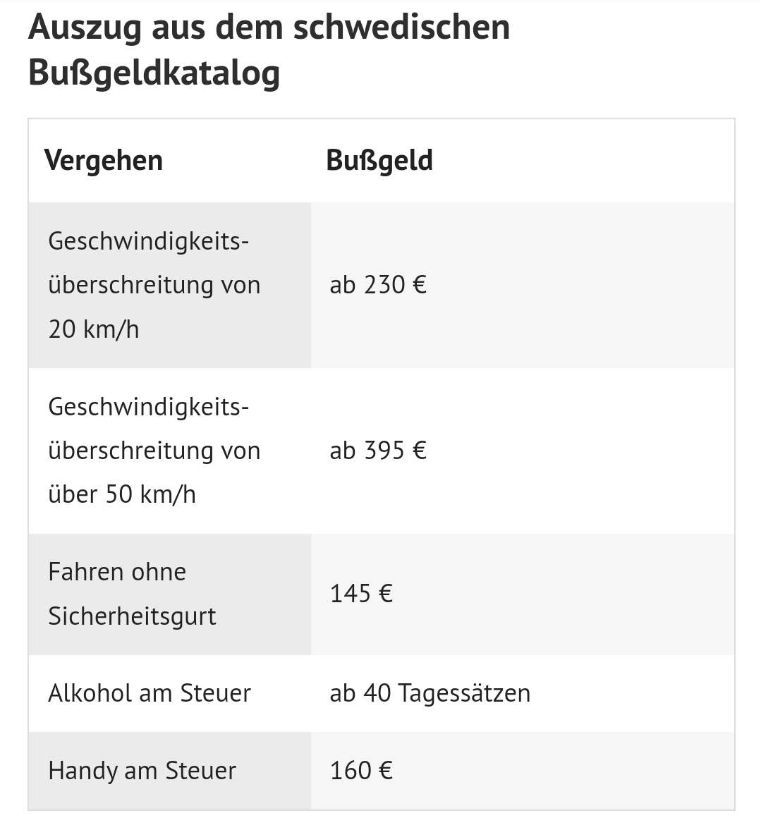 Die Strafen für zu schnelles fahren sind sehr empfindlich. Bereits ab 1 km/h Geschwindigkeitsüberschreitung (abzüglich Messtoleranz) innerorts droht eine Strafe von bis zu 250 €, außerorts bis zu 200 €.