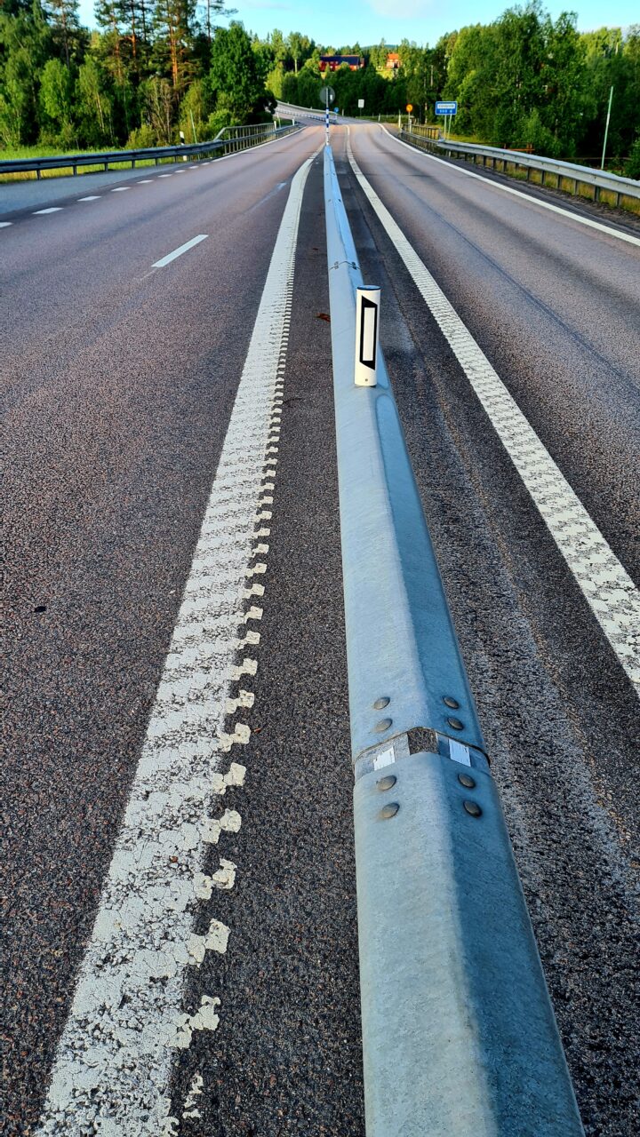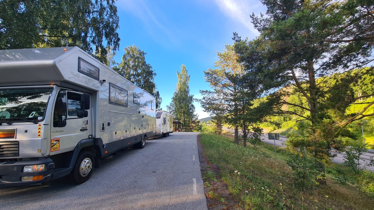 (Schweden) Auf der Europa „Autobahn“ E4. Also die E4 ist eine 1,5 spurige Landstraße. Tempo 80 und sehr kurvenreich. Dazu sehr sehr eng, keine oder selten Seitenstreifen. Keine Brems oder Beschleunigungsstreifen.