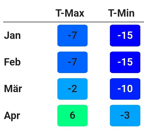 Die Jahreszeiten sind klar erkennbar, es gibt aber hohe Temperaturschwankungen zwischen Sommer (max. 30 Grad) und Winter (bis -40 Grad). Die jährliche Durchschnittstemperatur liegt dabei aber unter 0 Grad, denn die meisten Monate sind relativ kalt.