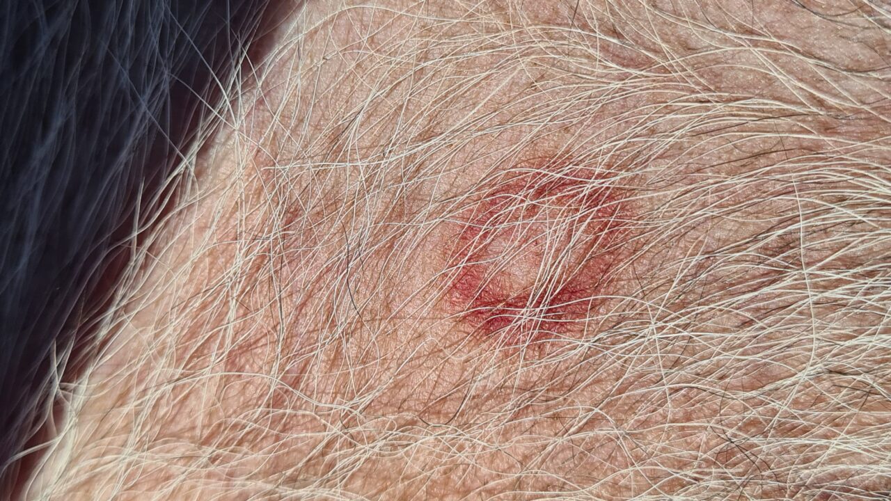 Ein runder roter Ring weist auf eine Entzündung hin, mutmaßlich von einer Zecke bzw der Borreliose.