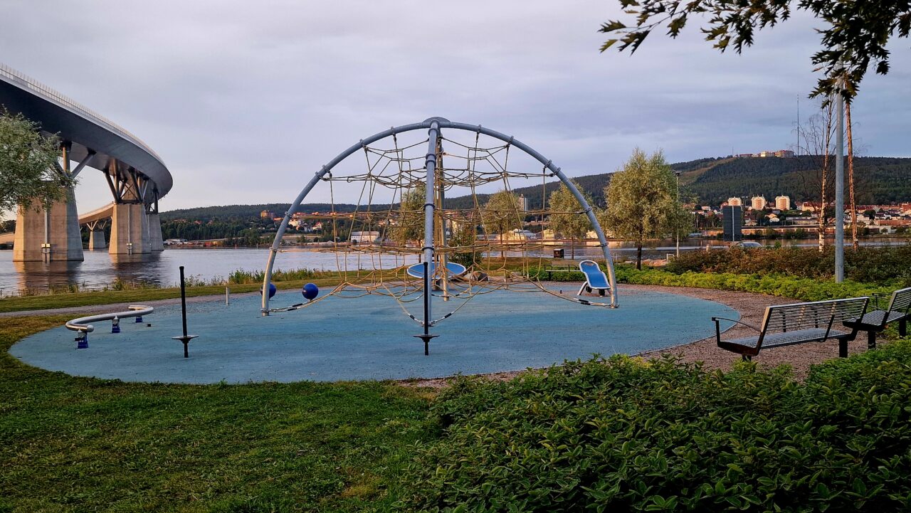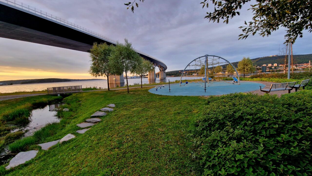 Hier, am Ufer unter der großen Brücke, wurden eine Spielplatz, ein Grillplatz, Grünflächen und ein kleinen Wasserlauf zum planschen für die kleinen Kinder gebaut.