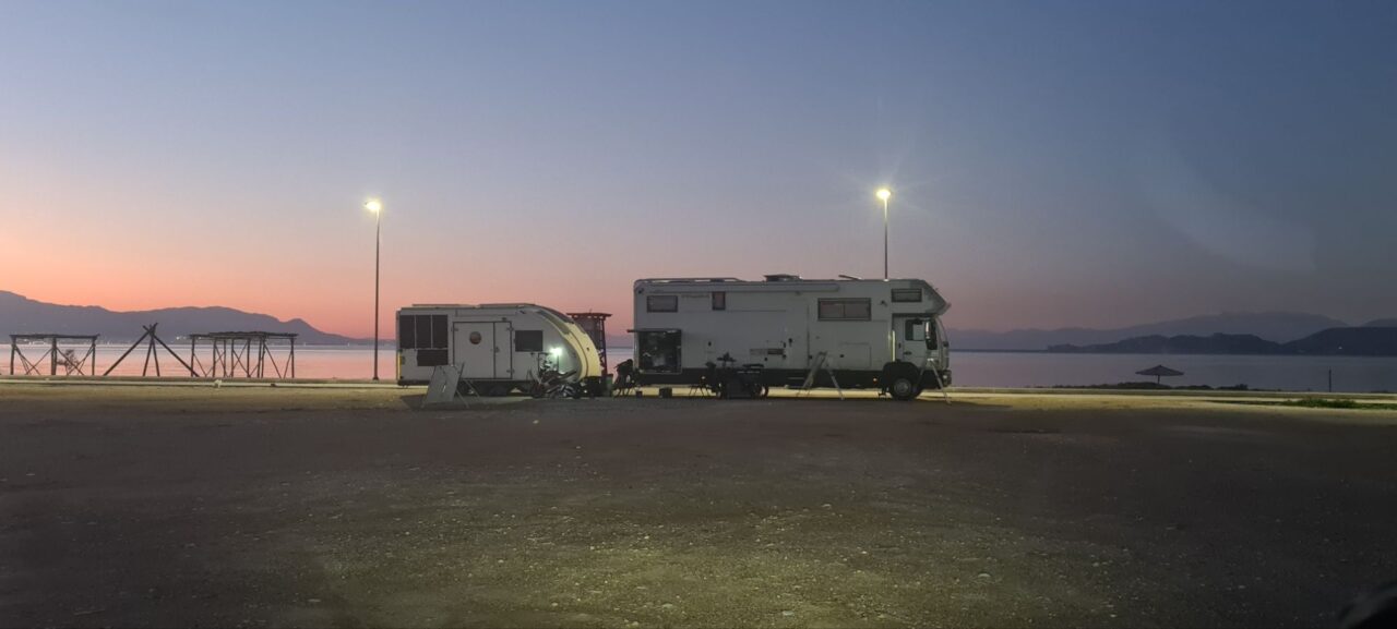 Ein kurzer Smalltalk, er war von dem riesigen Wohnmobil mit Anhänger und Auto beeindruckt.
