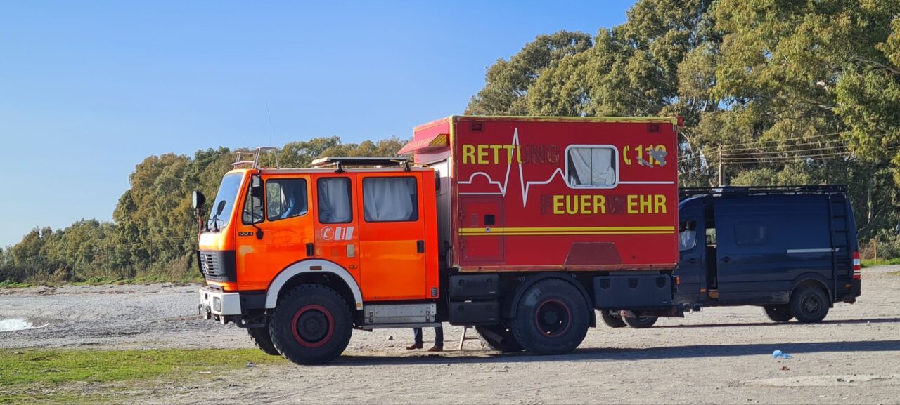 Einen Tag später steht plötzlich ein Feuerwehrauto am Strand, nicht mehr ganz aktuell, dafür aber geeignet für Offroad und mit Schlafplatz und Heizung.