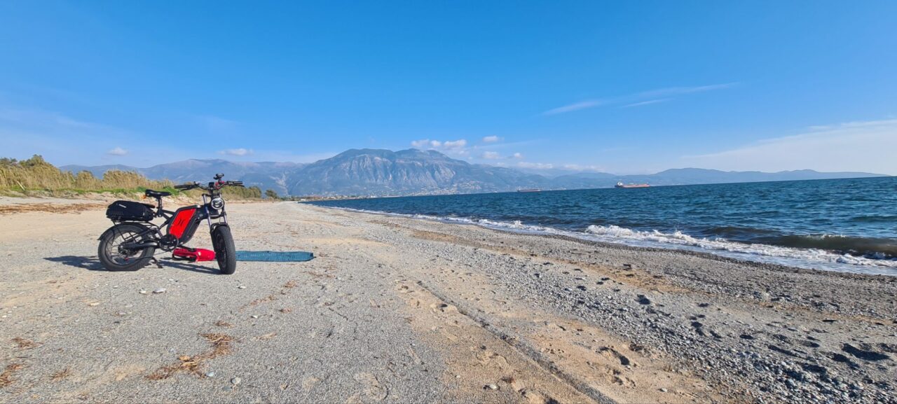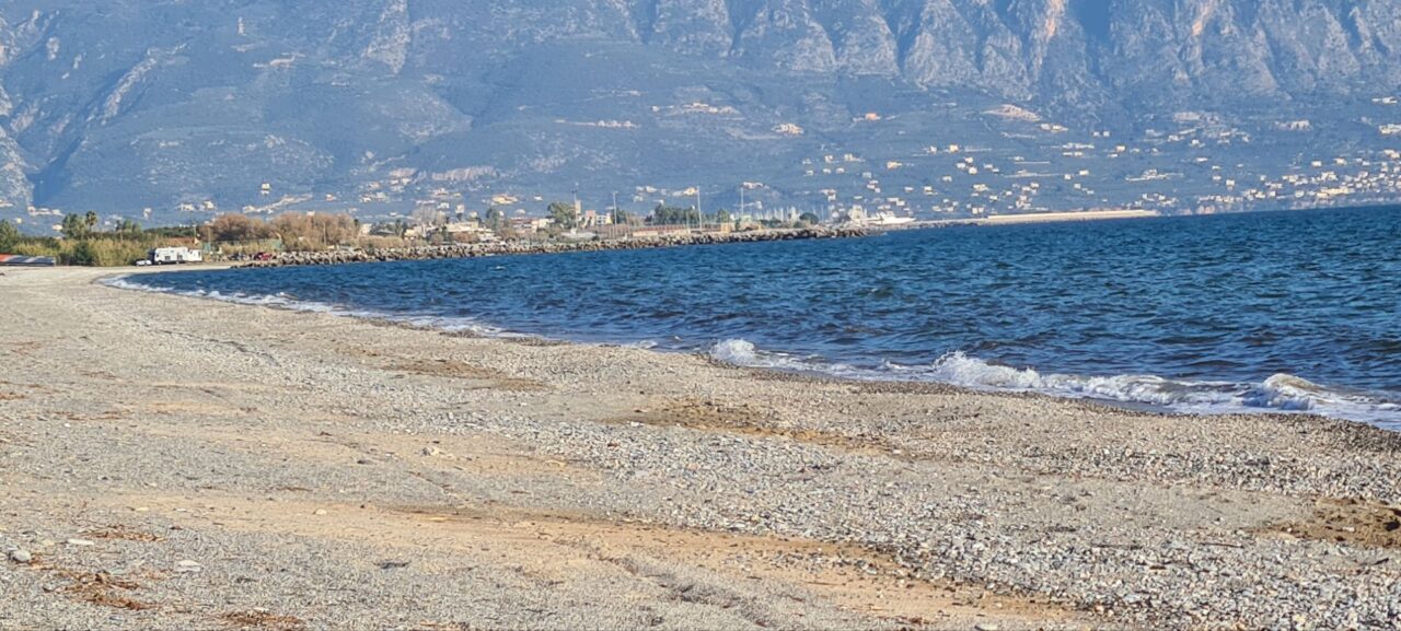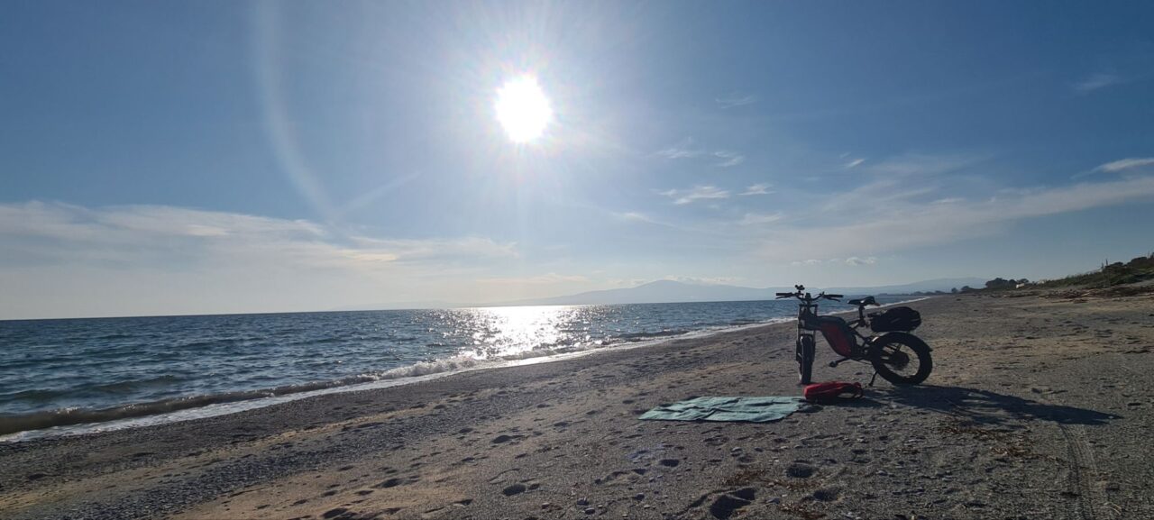 (Kalamata, Peloponnes /Griechenland) 2025-01-27 Da habe ich tatsächlich einen Volltreffer gelandet. Mit dem eCrossRad keine drei Minuten entfernt befindet sich ein für mich idealer Strandabschnitt.