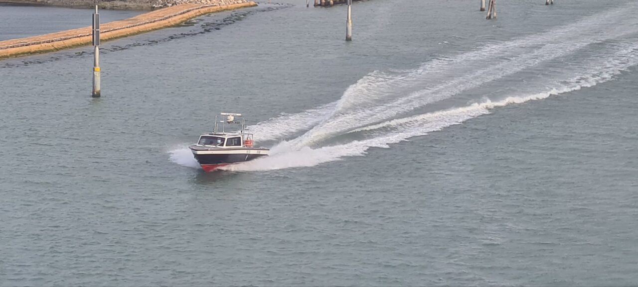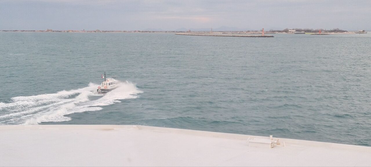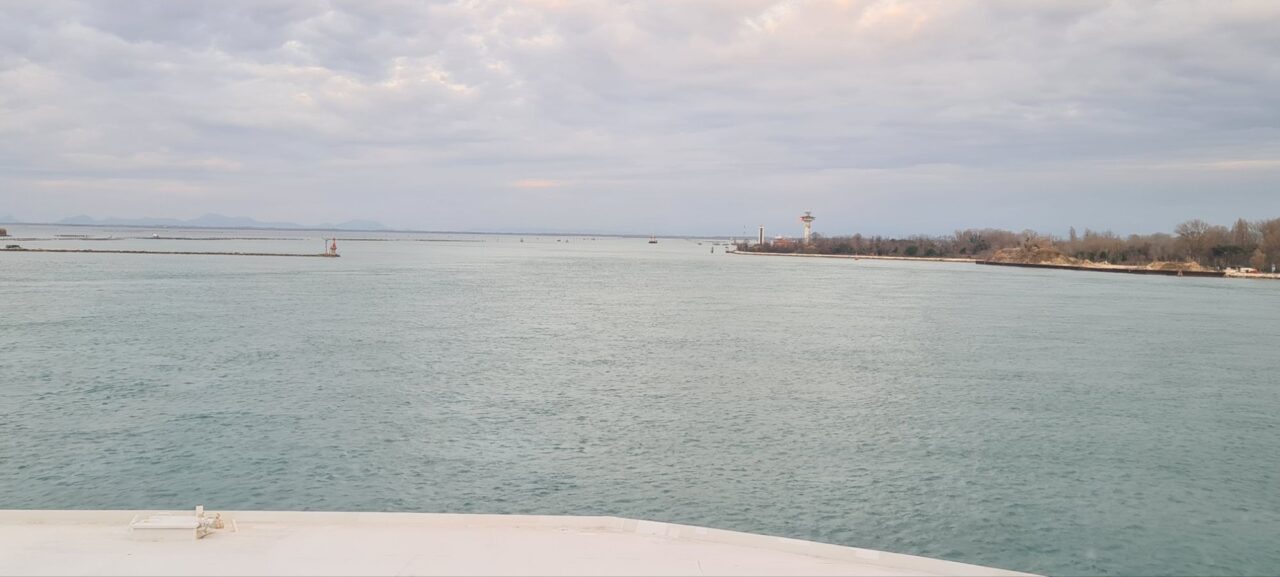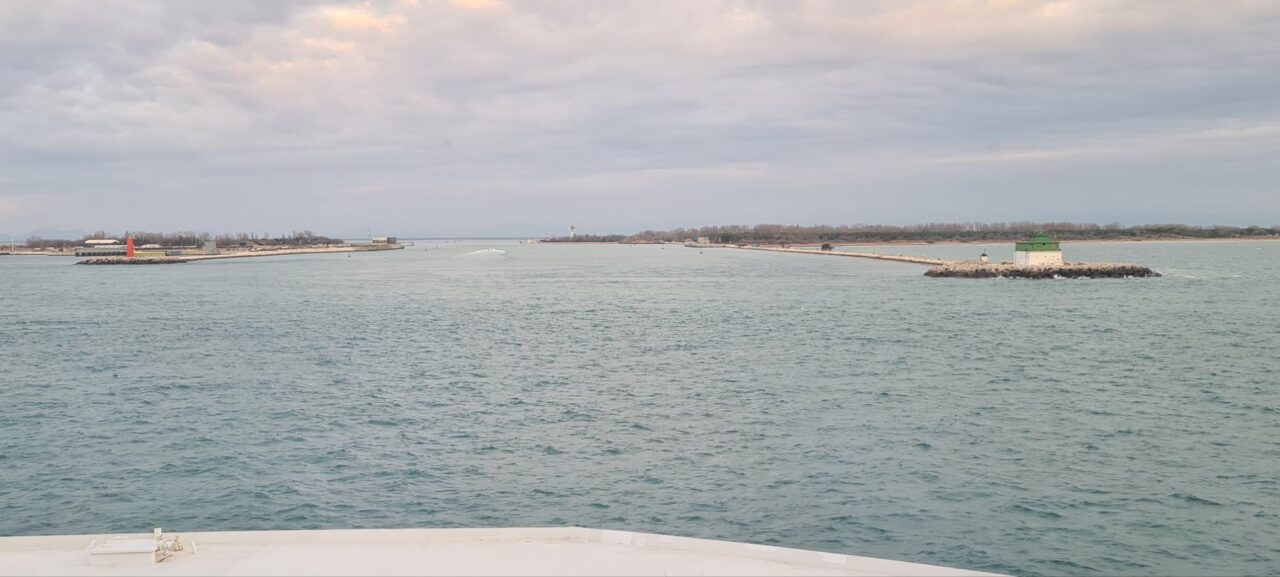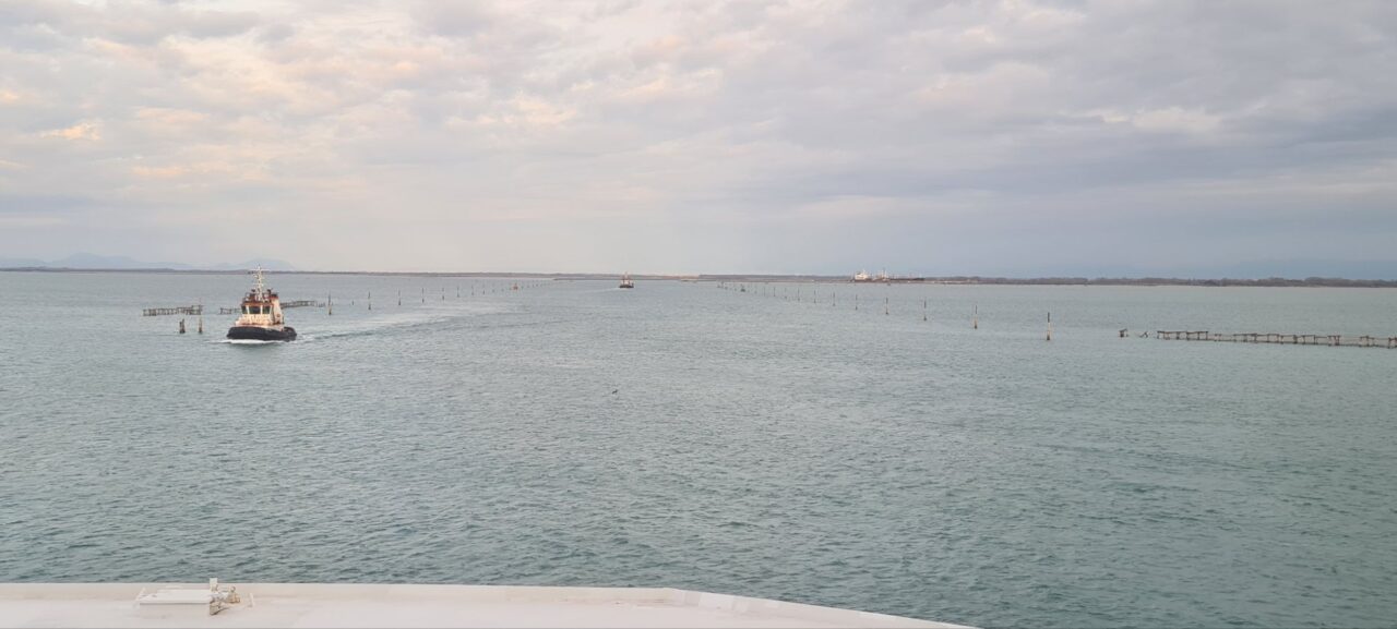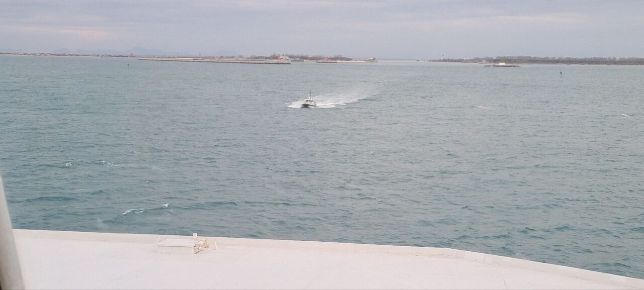 (Venedig /Italien /Bella Italia) Mit Hilfe eines Lotsen, welcher mit einem Schnellboot von der Hafenbehörde gebracht wurde, geht’s rein nach Venedig.