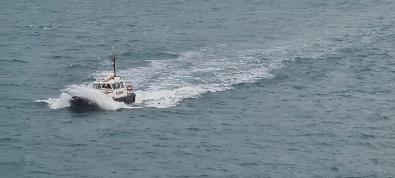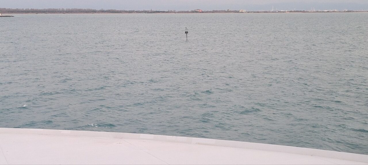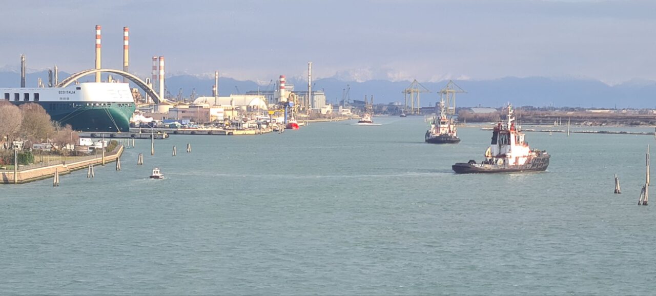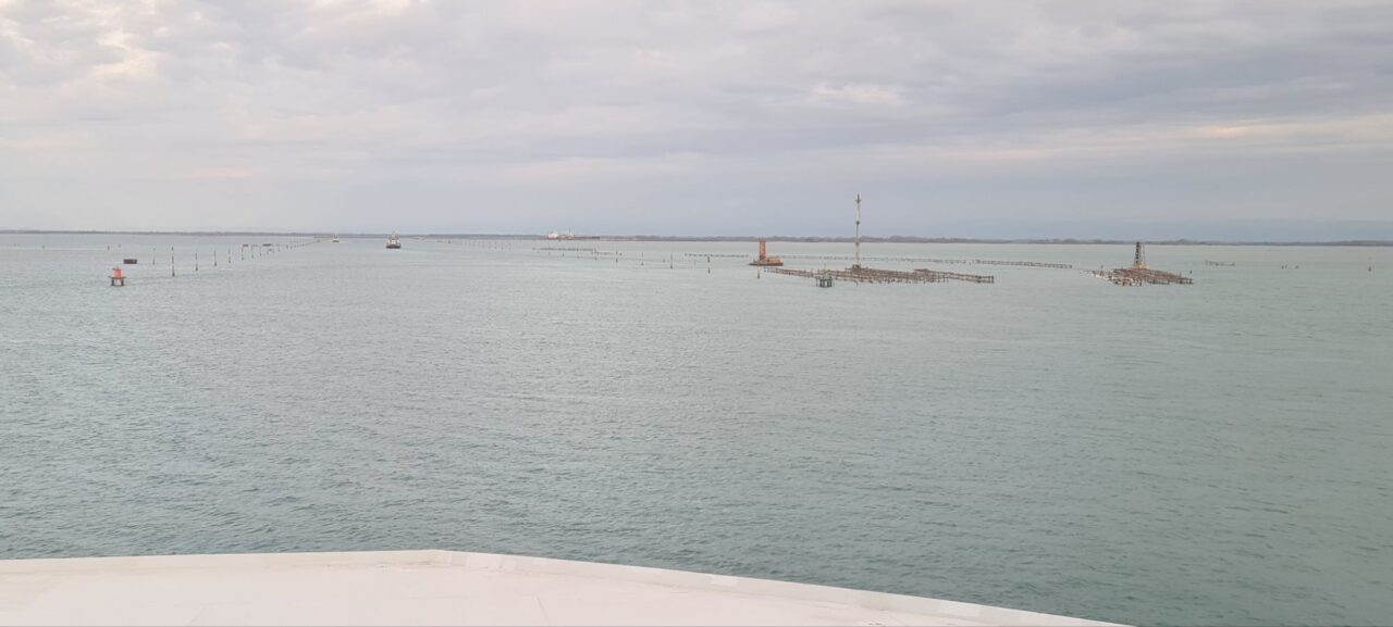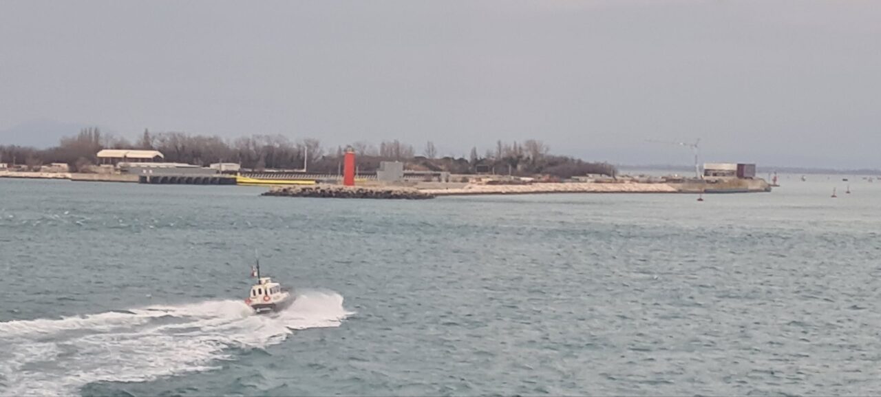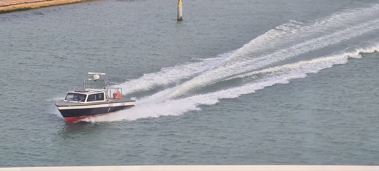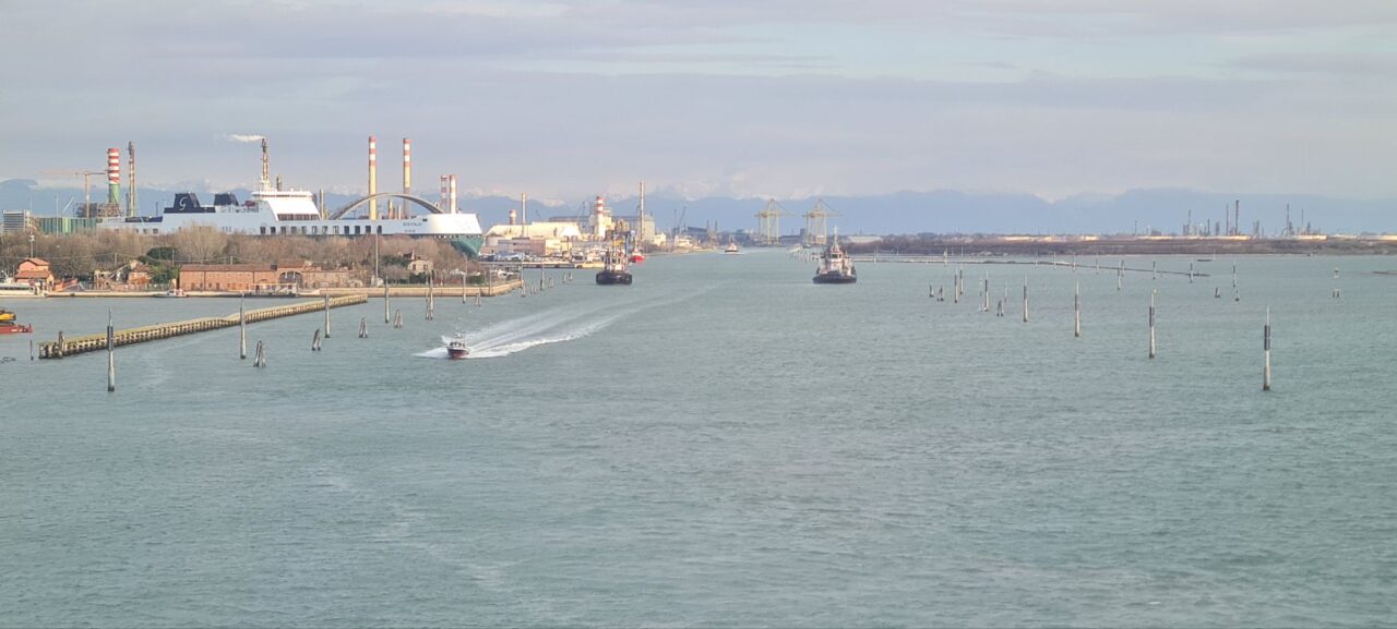 (Venedig /Italien /Bella Italia) Mit Hilfe eines Lotsen, welcher mit einem Schnellboot von der Hafenbehörde gebracht wurde, geht’s rein nach Venedig.