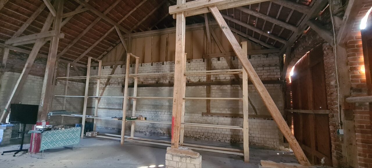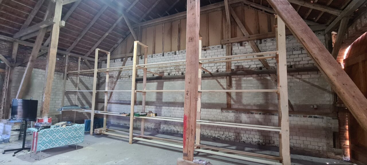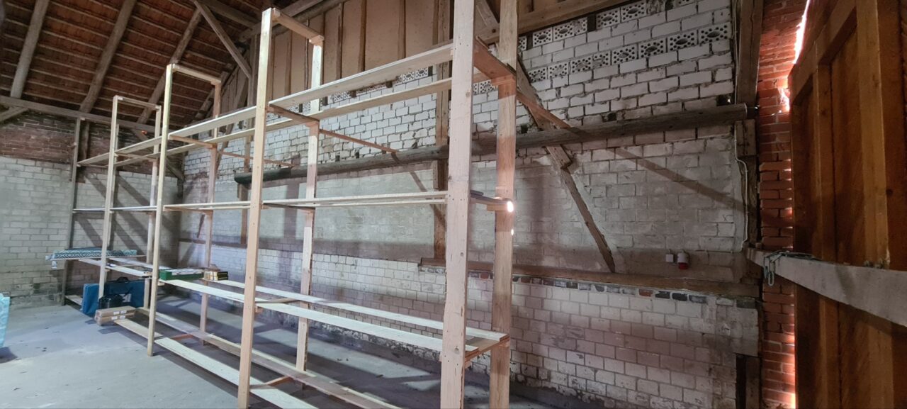 (Raddestorf /Deutschland) Dank Frank dem Eigentümer des Hofes und Lutz, meinem Pächter ist aus dem unbearbeitetem Holz, den Schalbrettern plus 40/60 mm Holzlatten ein stabiles und mit dem Boden und den Wänden verankertes Regal geworden.