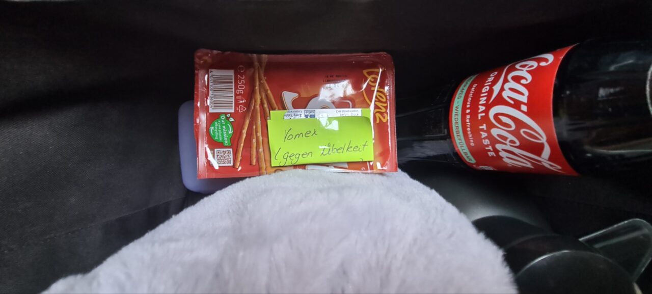 Wärmflasche, zwei Liter frischen Tee, ein Medikament gegen Übelkeit, Snacks und Cola. DANKE, die Rettung.
