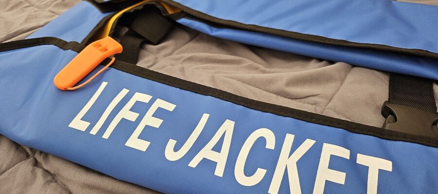 (China /Spanien /Niederlande /Deutschland) Eine klassische Rettungsweste mit Festkörper habe ich schon vor Jahren gekauft und immer im Lebensmobil dabei.