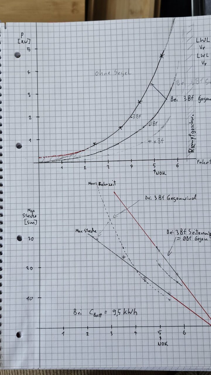 Wieviel elektrische Leistung wird bei DIESEM Boot bei welchem Wind auf der Weser stromaufwärts benötigt um welche Geschwindigkeit ohne Segel zu erzielen?