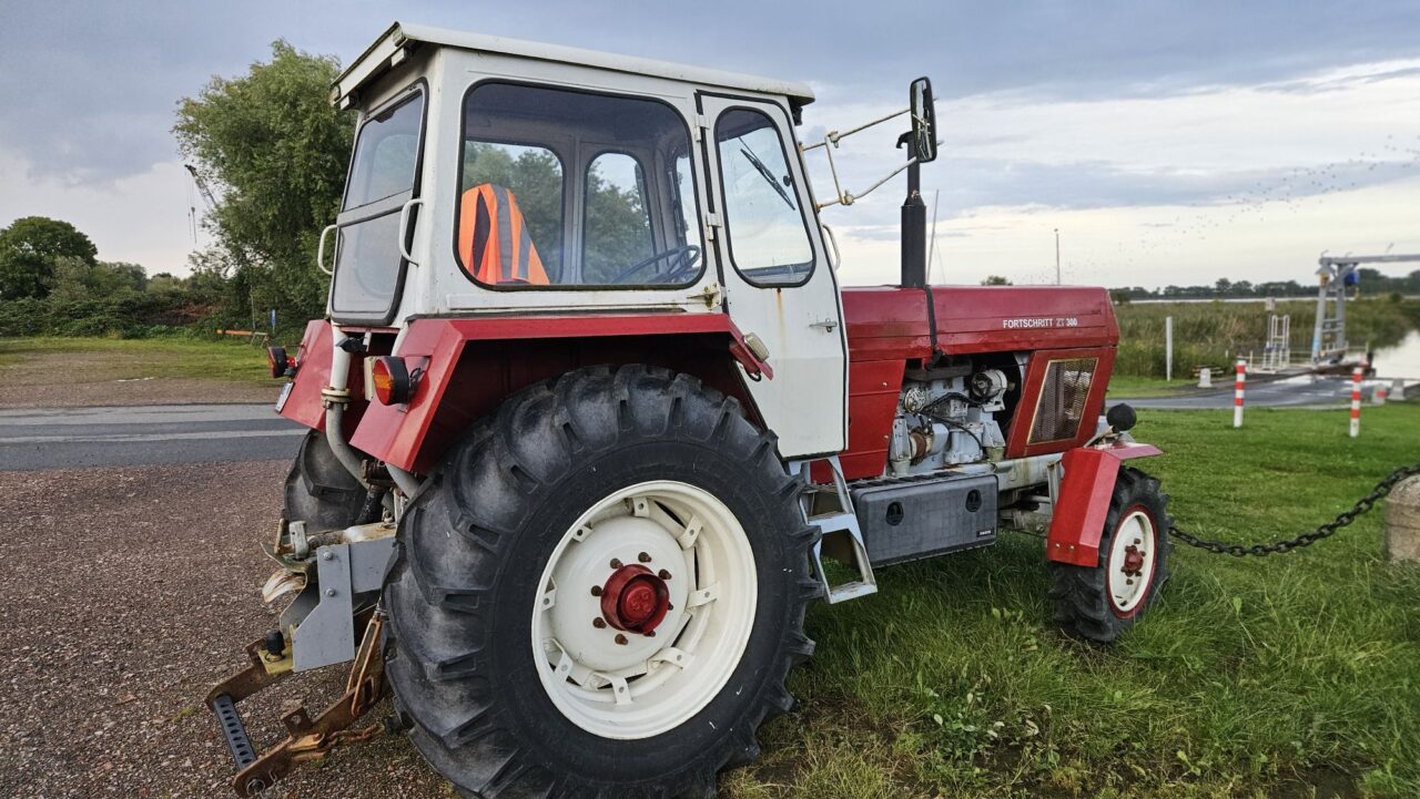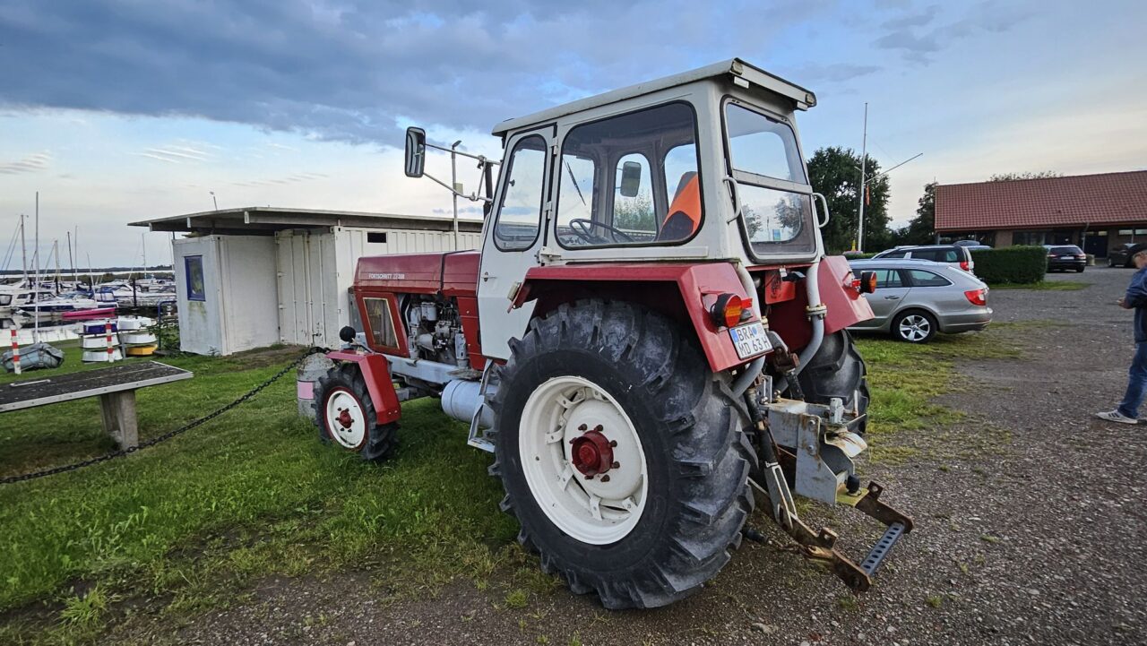 Um dann auf den Trailer, der derzeit noch in Blexen im WinterQuartier steht, mit dem Trecker transportiert zu werden. Etwa 9 Km bei Tempo 25.