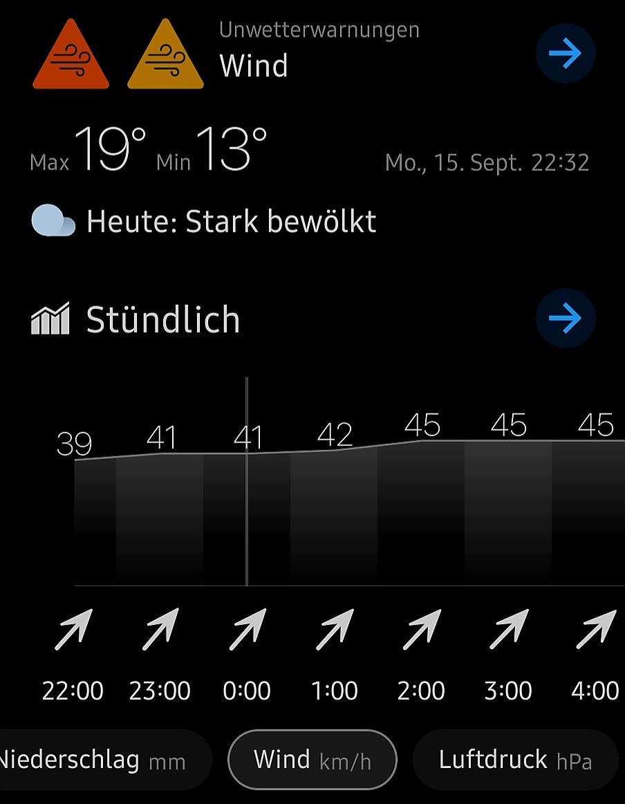 Es treten Sturmböen mit Geschwindigkeiten um 75 km/h (21 m/s, 41 kn, Bft 9) aus westlicher Richtung auf.
