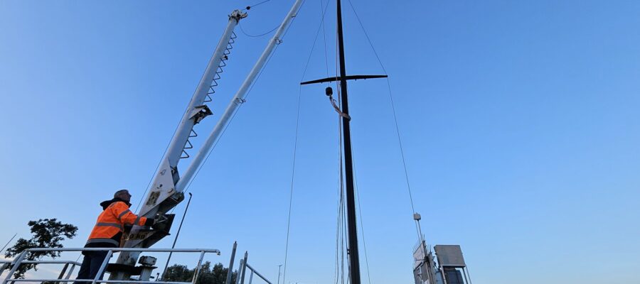 (Nordenham /Deutschland) Die gesamte Takelage autodidaktisch abbauen, Trecker fahren lernen und den Mast demontieren und mit dem Kran legen. Mehr