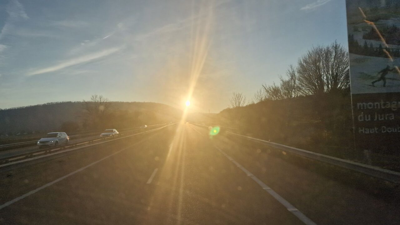 In der letzten Stunde immer gegen die untergehende Sonne gefahren. Auf der Autobahn nicht so problematisch, allerdings in den kurvigen Bergen muĂ man sehr aufpassen die Spur zu halten, weil man nichts sieht durch die extreme Blendung. Fahrfehler wĂ€ren der Albtraum…