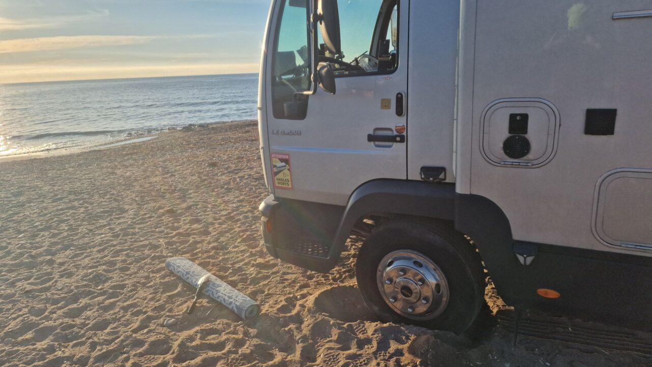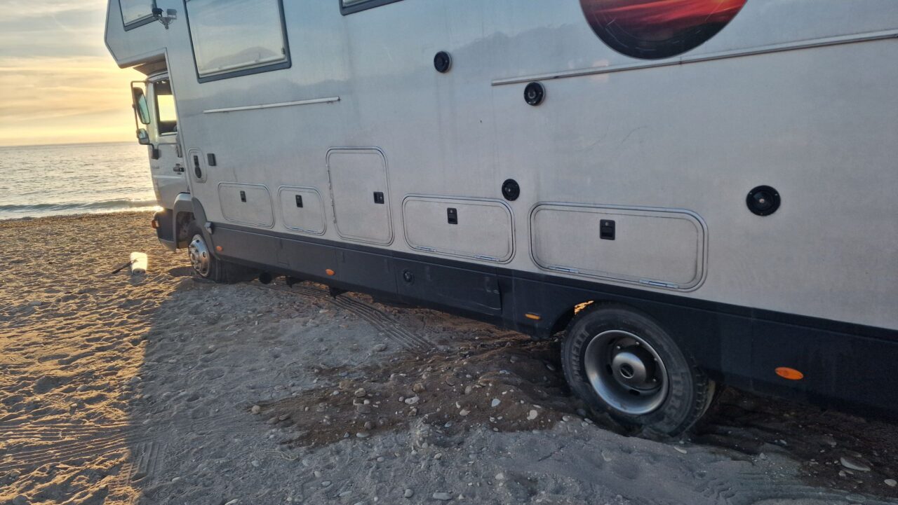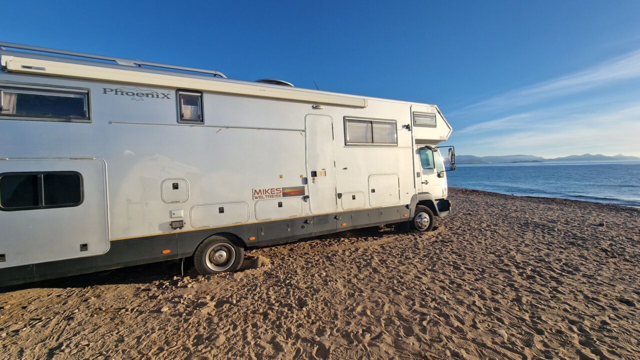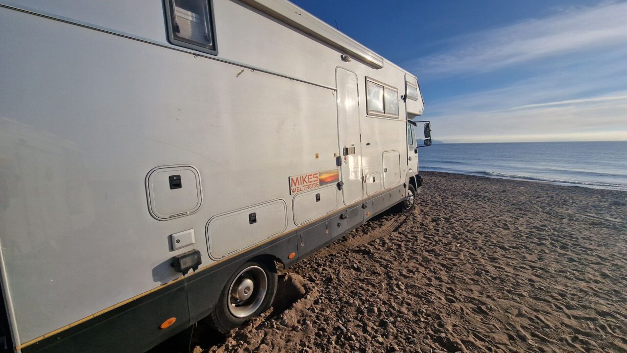 (MazarrĂłn in Andalusien /Spanien) Im Dreieck stehend mit dem abgekuppelten AnhĂ€nger zum Meer hin offen. Das hat doch was. Also am ersten Morgen „gerade“ umgeparkt.
