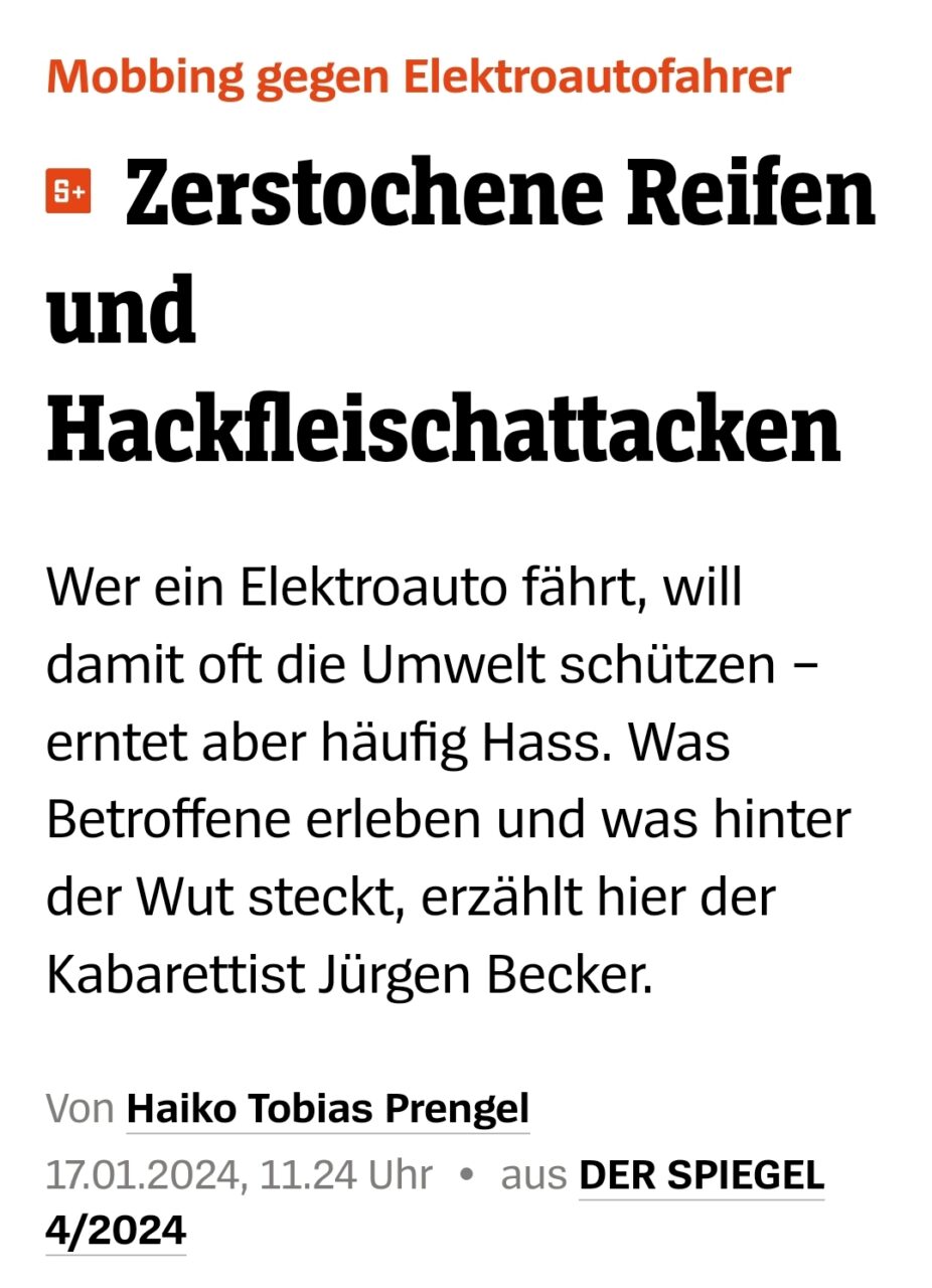 Auf E-Auto-Fahrer reagieren viele Menschen aggressiv, diese Erfahrung macht nicht nur Becker. Bundesweit werden Besitzer von Batteriefahrzeugen gemobbt – und es bleibt nicht immer bei Beleidigungen. Manche Opfer berichten von zerstochenen Reifen, Energieversorger von beschädigten Ladesäulen.